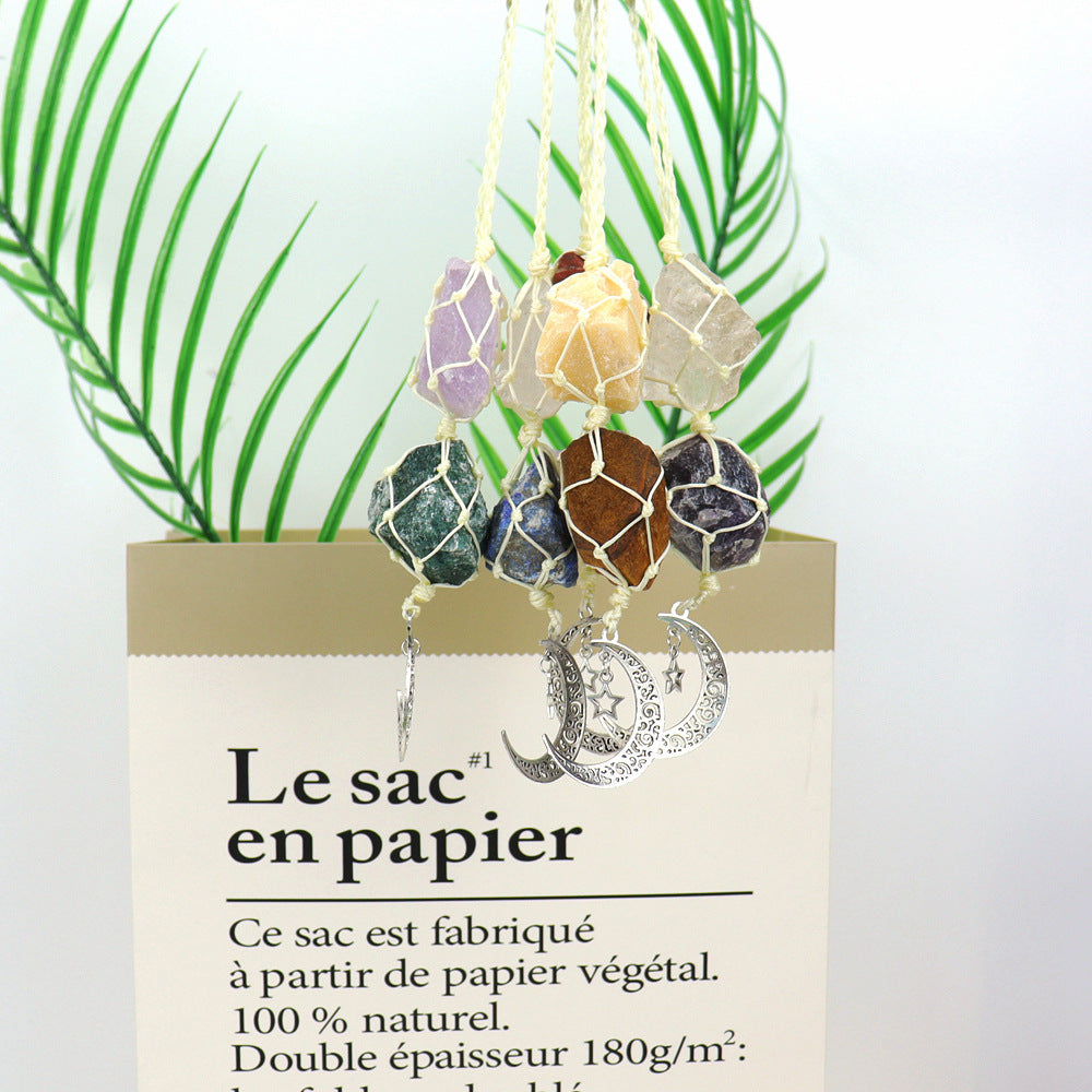 zensoullab Handmade Woven Raw Stone Crystal Pendant Star Moon Net Bag Car Hanging Amethyst Ornament