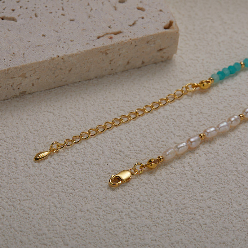 zensoullab S925 Sterling Silver Natural Amazonite and Freshwater Pearl Gemstone Necklace for Women, Niche Vintage Beaded Patchwork